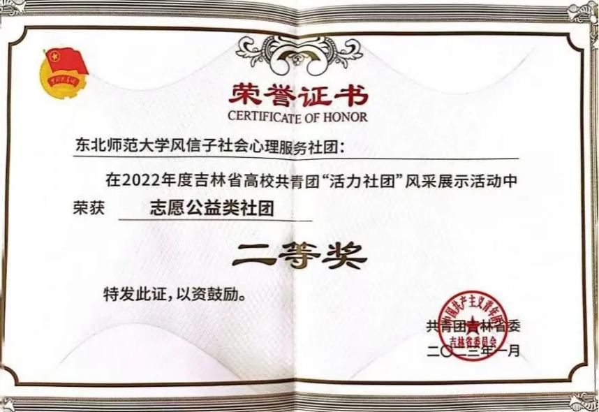 风信子社会心理服务社团凭借其在公益心理服务领域的突出表现,斩获多项荣誉:在吉林省高校共青团“活力社团”风采展示活动中荣获公益类社团二等奖,同时还获得长春市“高校文明杯”竞赛优秀学生社团称号。这些荣誉是对社团长期深耕心理公益服务的肯定,而社团的公益活动也始终以专业为基石,为社会心理服务贡献力量。