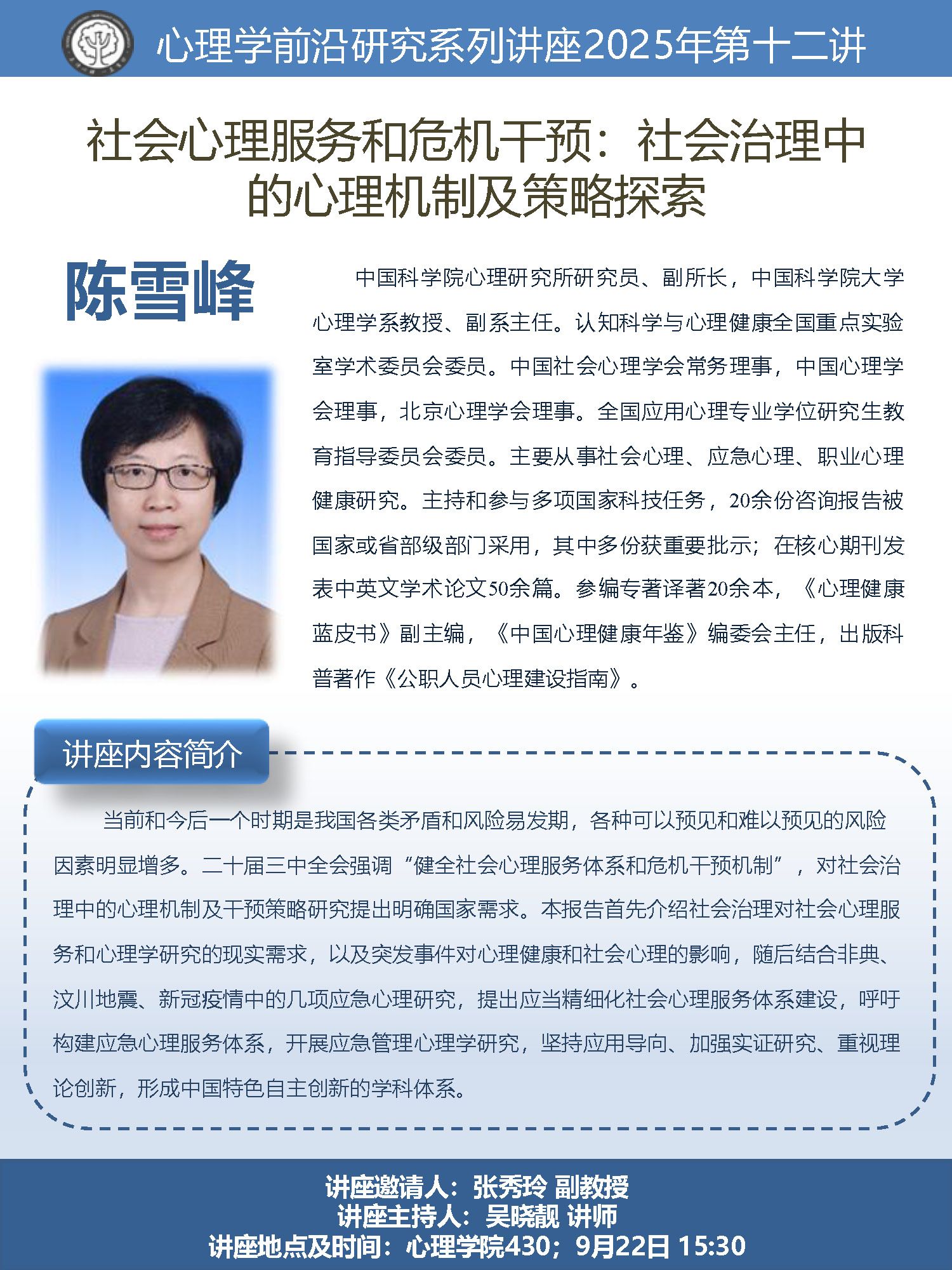 【心理学前沿研究系列讲座】陈雪峰:社会心理服务和危机干预:社会治理中的心理机制及策略探索