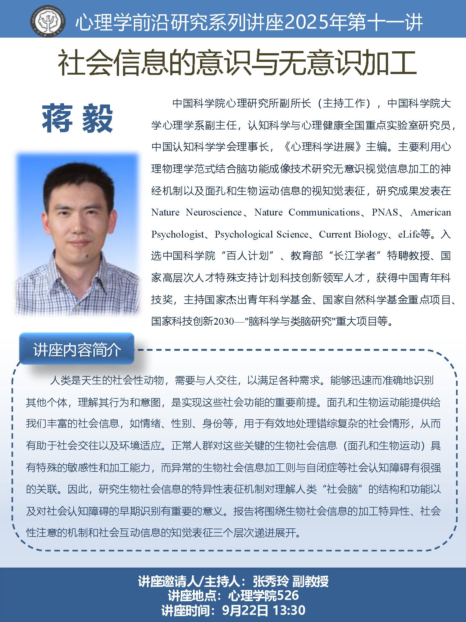【心理学前沿研究系列讲座】蒋毅:社会信息的意识与无意识加工