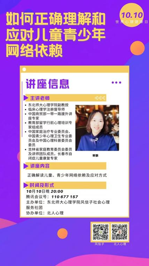 2021 年 10 月 19 日,风信子社团指导老师、心理学院副教授郭娟线上开展 “正确理解和应对儿童青少年网络依赖” 公益讲座。郭娟老师结合专业知识与实践经验,围绕网络成瘾的科学判断、电子产品合理管理、成瘾问题有效应对三大核心内容展开分享。家长们通过讲座建立了对网络依赖的正确认知,学会调控自身情绪、科学监管电子产品及应对成瘾问题的方法。社团将持续发力,助力家长关注孩子心理健康,陪伴孩子健康成长。