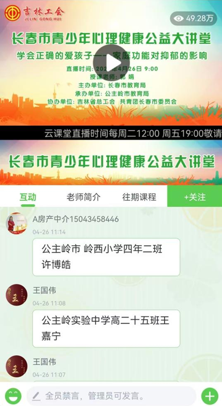 风信子社会心理服务社团指导教师郭娟,受长春市教育局邀请于2025年4月26日9:00开展了“学会正确的爱孩子——家庭功能对抑郁的影响” 的公益直播讲座,吸引超49.28万观众关注。